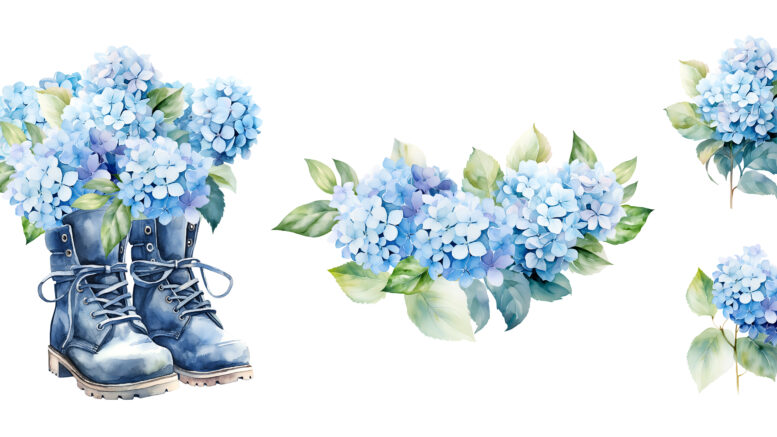 Watercolor set of blue hydrangea bouquets, floral illustration